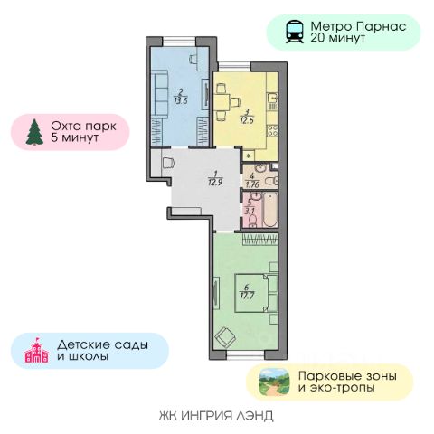 • 59 кв. м уюта и порядка: две просторные комнаты (по 13,4 кв. м) для родителей и ребёнка или кабинета, и большая кухня-гостиная (10,5 кв. м) — сердце вашего дома для приятных семейных вечеров.
