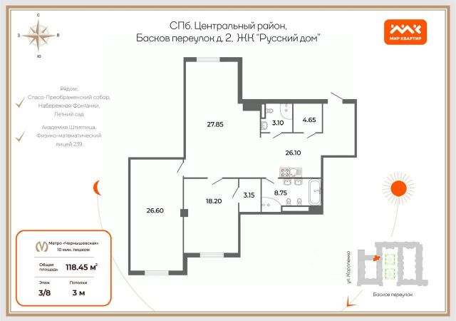 ОТЛИЧНАЯ ! 2-ЕВРО КВАРТИРА в ЭЛИТНОМ ЖК РУССКИЙ ДОМ ! С ПАРКИНГОМ ! Парковочное место ВХОДИТ в стоимость ! По адресу : Литейный округ , Басков переулок , 2. Общая пл. 74,20 кв.м. КОМНАТЫ: 20,10 кв .м + 20,90 кв м КУХНЯ : 14,0 кв м ВАННЫЕ комнаты : 5,5 кв м +2,10 кв.м Высота потолков 3 м. Прихожая : 11,60 кв м ОТЛИЧНАЯ квартира с классическим интерьером в приятных пастельных тонах . И очень уютной атмосферой ! РЕМОНТ: Дизайнерский с современными материалами ПРЕМИУМ класса в отделке : добротная входная дверь , обои под покраску , потолки гипсокартон с декоративными элементами, полы- керамогранит с подогревом , в комнатах - паркетная доска . Установлены кондиционеры в гостиной и спальне. Зонированное освещение по всей квартире . Качественные межкомнатные двери из натурального массива . Предусмотрены вместительные шкафы для хранения вещей . КУХНЯ- ГОСТИНАЯ : ЗОНА КУХНИ оснащена современным кухонным гарнитуром с МРАМОРНОЙ столешницей , качественной встроенной техникой , включая : варочную панель, микроволновую печь , духовой шкаф , посудомоечную машину , холодильник и ОБЕДЕННУЮ зону. ГОСТИНАЯ также полностью укомплектована мебелью : комфортный , светлый диван с мягкими подушками , журнальный стол , полка под телевизор со стеклянными дверцами и декоративные аксессуары . МАСТЕР-СПАЛЬНЯ совмещена с просторной ванной 5,5 кв м и полностью укомплектована всей необходимой мебелью для комфортного отдыха. Кровать с мягким изголовьем и матрас - ORMATEK , прикроватные тумбы , шкафы , кресло и туалетный стол. ВАННАЯ комната и гостевой туалет оснащены современной мебелью и техникой . Счетчики на свет и воду. Вся мебель техника остаются новым владельцам ! ПАРАДНЫЕ отделаны высококачественными материалами , облицованы натуральным мрамором , деревянными вставками, украшены зеркалами и оригинальным светом . ДОМ построен в традициях древнерусского зодчества и раннего модерна , Территория ЖК Русский Дом полностью закрыта . Установлено видеонаблюдение , постоянно находится охрана . Внутри комплекса предусмотрены закрытые дворики, детские площадки и зоны отдыха для проживающих. Паркинг подземный . ИНФРАСТРУКТУРА: ШИКАРНОЕ местоположение! Исторический центр города . Летний сад, Марсово Поле , Михайловский замок , Фонтанка, набережная Невы , Таврический сад все в пешей доступности . ТРАНСПОРТ: Метро Чернышевская -10 минут пешком Метро Маяковская -14 минут пешком СДЕЛКА: Прямая продажа! Звоните! Наталья.
