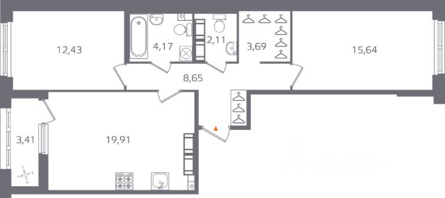 Планировка отличается продуманностью: просторная кухня площадью 14,4 м², изолированная комната 12,39 м², компактный санузел (3,94 м²) и удобная прихожая (4,69 м²). Балкон (2,89 м²) добавляет полезное пространство, а общая площадь с учетом лоджии составляет 38,31 м².