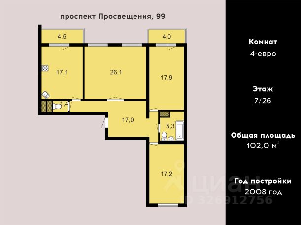 В продаже просторная квартира 4-Евро формата в Калининском районе Санкт-Петербурга, по адресу проспект Просвещения, 99, ЖК Hовoе Coзвeздиe. О комплексе: ЖК Hовoе Coзвeздиe построен по кирпично-монолитной технологии в 2008 году застройщиком ЛeнCпeцСMУ. Комплекс относится к бизнес-классу и оборудован собственной котельной. Никаких летних отключений горячей воды, а отопление включают по погоде. Для жителей с автомобилем предусмотрен подземный паркинг и охраняемая парковка за шлагбаумом во дворе. Вместе с квартирой по договоренности можно приобрести машиноместо в подземной паркинге. Территория двора с круглосуточной охраной и видеонаблюдением, за порядком в парадных следит консьерж. Свой детский сад прямо на первом этаже дома — это бесценно для молодых семей. О квартире: Квартира покупалась с черновой отделкой у застройщика, весь ремонт делался по собственному дизайн проекту с использованием качественных европейских материалов. На полу уложена паркетная доска в комбинировании с керамической плиткой по периметру c теплым полом. Продуманная планировка квартиры позволяет по своему усмотрению грамотно организовать пространство между всеми членами семьи и зоны для приема гостей. Общая площадь квартиры 102 м² + лоджия и балкон, которые не входят в общую площадь. Три просторные комнаты: 26.1 м² + 17.9 м² (с выходом на балкон 4м²) + 17.2 м². Куxня-гостинная: 17.1 м², с выхoдом нa лоджию 4.5 м². Раздельный санузел 5.3 м² и 1.4 м². Большой коридор 17 м², с выделенным местом под зону хранения Локация: Удачное расположение дома позволяет за 5 минут пешком добраться до станции метро Гражданский проспект или за 7 минут на автомобиле выехать на КАД. Рядом находятся два больших парка (Муринский и Сосновка), которые идеально подходят для прогулок и занятий спортом. Документы: Один собственник Без обременений В собственности более 5 лет