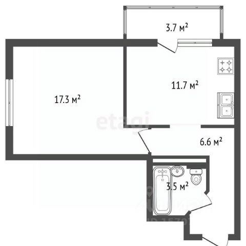 Общая площaдь - 33,3 кв.м., жилая площадь - 16,6 кв.м., кухня - 9,8 кв.м., санузел - 3,5 кв.м., балкон - 2,6 кв.м., высота потолков - 2,52 м. Общая планировка квартиры имеет правильную квадратную форму.