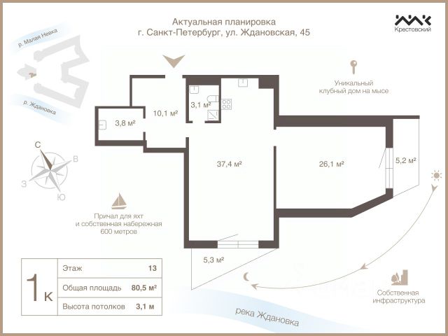 Арт. 81470799 Предлагается к продаже потрясающая квартира в ЖК Леонтьевский мыс. Из всех окон квартиры открывается панорамный вид на Малую Невку, Крестовский остров, Лазаревский мост. С балкона виден на залив, Лахта центр и Газпром арена. Планировка: Большой холл. 2 изолированые команты, большая гардеробная, гостевой санузел, большой санузел с окном, широкий балкон, кухня-гостинная с панорамным остеклением по кругу почти на 180 градусов! Жилой комплекс Леонтьевский мыс построен по проекту известного французского архитектора Филиппа Старка. Находится в уникальном месте слияния 2х рек. На мысу благоустроеная прогулочная зона без автомобилей для отдыха, созерцания закатов и прогулок с детьми. Открыт ресторан с терассой на пристани для яхт. Красивые лобби для ожидания и комнаты для переговоров. Круглосуточная охрана и видеонаблюдение. Внутренний закрытый двор, детская комната, колясочные и места для хранения велосипедов. 3х уровневый подземный паркинг с доступом из лифта, где можно приобрести 2 и более парковочных мест. Удобная транспортная доступность: До исторического центра 10 минут, на Васильевский остров 5 минут, в Аэропорт и Курортный район 30-40 минут по ЗСД. Свяжитесь с нами, мы организуем просмотр и ответим на все оставшиеся вопросы!