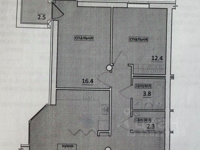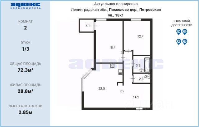 Площадь кухни-гостиной 22,5 кв.м, комнат 16,4 кв.м с выходом на балкон и 12,4 кв.м, санузел раздельный.