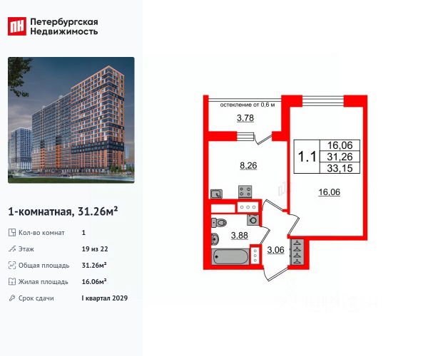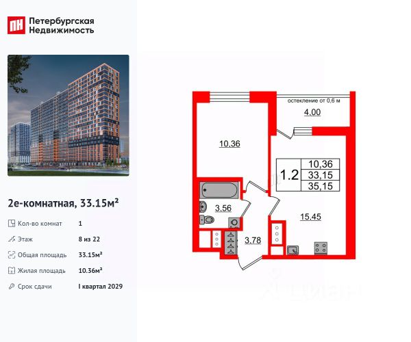 - 1 комнатная квартира европланировки площадью 31,52 кв м + лоджия 3,73 кв м,
