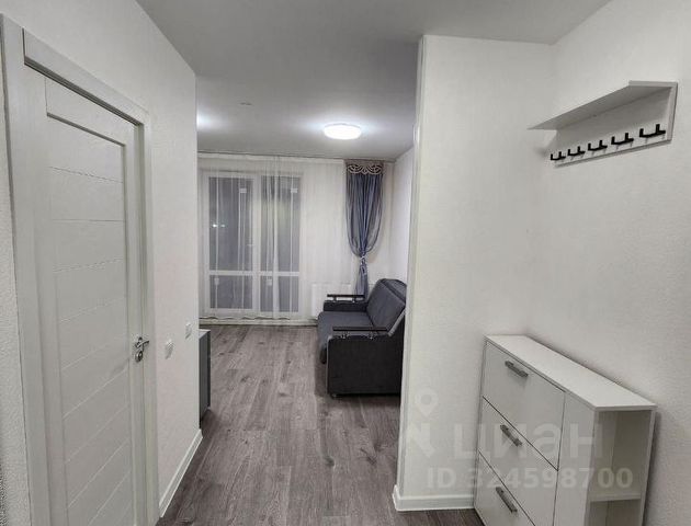 Студия широкая и квадратная, два окна, что удобно для расстановки мебели и комфорта проживания. Мебель и техника новые, все остается будущим владельцам.