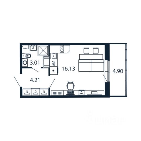 О квартире: Квартира студия, общей площадью 25.01 м², кухня-гостиная - 14.69 м², прихожая с нишей под шкаф купе- 3.43 м², санузел - 3.64 м², лоджия - 3.25 м². Увеличенные оконные проёмы.