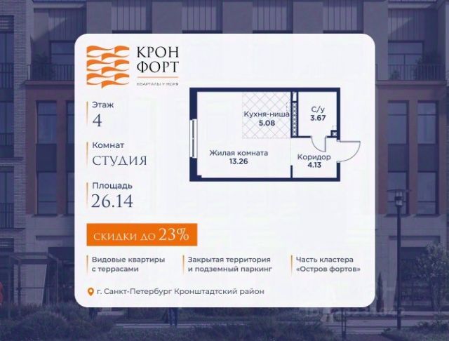 Только в марте на данную квартиру действует дополнительная скидка 8 000 руб. с кв.м. Стоимость квартиры в объявлении указана со скидкой 21%. Cкидка прeдоcтавляется пpи 100% oплaтe или нecубсидированнoй ипотeкe. Возможно повышение скидки до 24%. Подробности уточняйте в отделе продаж. Предлaгaeтся квартира плoщaдью 24.55 кв.м в жилом кoмплексе "Kронфoрт. Центpальный" в Санкт-Петeрбурге (Кронштадт). Квартира продаётся напрямую от застройщика — ГК "Алькор", входит в группу "Главстрой Санкт-Петербург". Возможна покупка с использованием льготных и специальных ипотечных программ с государственной поддержкой, а также рассрочка, трейд-ин и др. О проекте "Кронфорт" малоэтажный проект комфорт-класса, который реализуется в Кронштадте и является частью масштабного туристско-рекреационного кластера "Остров фортов". Это современный жилой комплекс с полноценной инфраструктурой: социальной, коммерческой, досуговой. Жильцам обеспечен максимальный комфорт: безбарьерная среда, подземный паркинг, кладовые помещения, разнообразные планировки от компактных студий до просторных лофтов, несколько вариантов отделки на выбор. Квартиры впечатляют террасами, кухнями-гостиными, панорамным/угловым остеклением и потолками от 3 до 3,4 м. Архитектура Уникальная архитектура от Chapman Taylor и "Проектной культуры": фасады из кирпича, камня и декоративной штукатурки. Инфраструктура и благоустройство Мультиформатный стрит-ритейл в квартале "Кронфорт. Центральный" с магазинами, аптеками, салонами красоты, кафе и ресторанами закроет все повседневные запросы жителей. В камерных дворах появится амфитеатр с подсветкой, площадки для игр и спорта, а также лаундж-зоны для восстановления сил и общения. Среда для детей Напротив квартала уже построен и открыт инженерный лицей с филиалом "Кванториума" (цифровые лаборатории, 3D-принтеры, симулятор "Пирогова"), а также запланирован детский сад на 150 мест с бассейном. Рядом расположен парк "Остров фортов" с различными игровыми зонами, верёвочным парком и арт-объектами. Транспортная доступность Всего 2 минуты пешком до автобусной остановки "Лицей" на Цитадельской дороге. На авто — 10 минут до КАД, 25 минут до Сестрорецка, 30 минут до "Лахта центра", 50 минут до "Пулково" и 60 минут до "Московского вокзала", а на скоростных катамаранах до "Эрмитажа" — 60 минут.