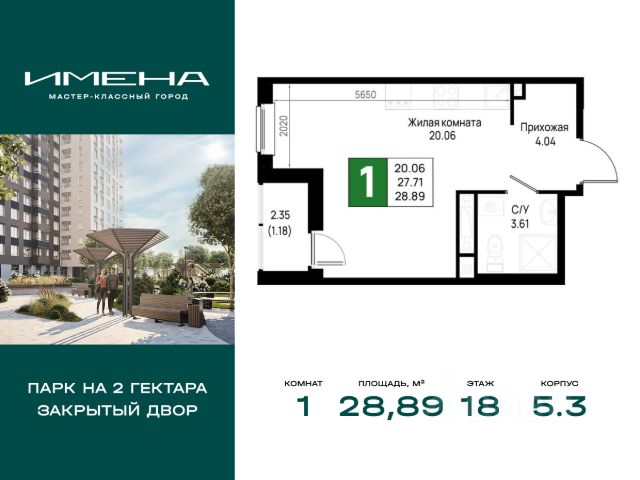 В живописном районе на юге Санкт-Петербурга, рядом с берегом Невы и Невским лесопарком, продается 1-комнатная квартира площадью 28.89 кв. м, расположенная на 18 этаже 21-этажного дома 5.3. Квартира находится в жилом комплексе комфорт-класса "Имена" от ГК "ССК". О проекте Жилые кварталы "Имена" - это проект, призванный стать отправной точкой для самой значимой главы вашей личной истории. Здесь созданы все условия для формирования крепких семейных ценностей, реализации амбиций и поиска источников для новых достижений. Уникальное расположение на стыке городской динамики и природной красоты обеспечивает максимальный комфорт и сбалансированный образ жизни. Это место для тех, кто мастерски видит перспективы, но хочет жить комфортно уже сейчас. Комфорт без компромиссов Квартиры с особым вниманием к деталям: витражное остекление балконов, высокие потолки (до 2,75 м), микроклиматические клапаны на окнах, разводка коммуникаций и электрики, а также интеллектуальный учёт энергоресурсов. Ваш новый дом - это территория под надежной защитой. Умный шлагбаум и передовые системы видеонаблюдения гарантируют безопасность. Передвижение по этажам легкое и приятное благодаря скоростным бесшумным лифтам, а для велосипедов и колясок предусмотрены специальные закрытые помещения. Мы позаботились обо всем: от теплых и гостеприимных холлов до вместительных кладовых. Оцените удобство бесконтактных домофонов с управлением через мобильное приложение и легкий доступ благодаря входам на уровне земли. Успейте приобрести квартиру на выгодных условиях уже сегодня! Доступна ипотека, рассрочка на 6 и 12 месяцев, а также полная оплата. * Возможности для отдыха Сердцем жилого комплекса "Имена" станет бульвар длиной более 1200 метров с парком площадью 2 гектара - пространство, где каждая деталь направлена на создание условий для комфортного отдыха и продуктивной работы на свежем воздухе. Лаунж-зоны с WI-FI, многоуровневое освещение и тщательно спроектированное озеленение превращают это место в идеальное сочетание природы и технологий, где приятно бывать в любое время дня. Для тех, кто предпочитает спокойные практики, предусмотрена крытая площадка для йоги, медитаций и групповых занятий. Любители активного образа жизни оценят воркаут-площадки, уличные тренажеры, беговые дорожки с мягким покрытием и велотреки с датчиками для подсчёта пройденных кругов. Всё рядом Всё необходимое для комфортного проживания находится внутри квартала: - Общественный центр для жителей: пространство для общения, обучения, творчества и саморазвития. - Открытый кинотеатр с показами фильмов и мини-концертами. - Фермерский рынок, где всегда можно купить свежие продукты, цветы и авторские товары ручной работы. - Современные школа и детский сад. - 10 многоуровневых наземных паркингов на 3500 машино-мест; - Магазины, кафе, рестораны, фитнес-клубы и салоны красоты на первых этажах домов. "Имена" - кварталы, где создаётся будущее. *Подробности о способах покупки квартиры уточняйте по телефону офиса продаж.