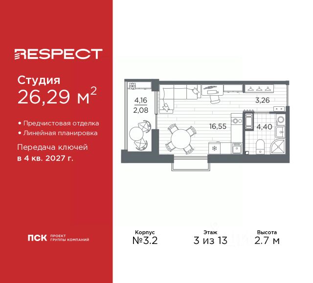1-комн. квартира-студия с отделкой в ЖК "RESPECT" на 11 этаже. Общая площадь: 27.67 кв.м., площадь гостиной 17.98 кв.м., из которых 5 кв.м. выделено под кухонную зону. Все окна выходят на одну сторону. В квартире один балкон, один совмещенный санузел. Высота потолков 2.7 м. Дом монолитный, многоподъездный, переменной этажности, от 8 до 13 этажей. Квартира находится в 1-й секции высотой 13 этажей в корпусе 3.3. На этаже 6 квартир. В подъезде 1 пассажирский и 1 грузовой лифт. Начало строительства - 3 квартал 2025 года. Окончание строительства - 4 квартал 2027 года. Оформление сделки по договору долевого участия. В шаговой доступности от жилого комплекса находятся станции метро (расстояние по прямой): "Лесная" (800 м), "Площадь Мужества" (1.4 км), "Выборгская" (1.9 км), также недалеко от этого корпуса расположены станции метро: "Академическая", "Политехническая". Жилой квартал "RESPECT" строится на Полюстровском пр, 87, в одной из самых востребованных локаций Петербурга. В 10 минутах пешком - метро "Лесная" и в 10 минутах на транспорте - Петроградская сторона. Высота домов от 7 до 13 этажей. Квартиры сдаются с отделкой white box и с чистовой отделкой. На территории Respect строится школа на 1125 учащихся и детский сад на 240 мест. Запроектированы собственная газовая котельная, закрытая территория, дворы без машин и подземные паркинги с лифтами. В проекте предусмотрены трапециевидные балконы или остекленные лоджии, которые, с одной стороны, исключают монотонность фасада, являясь декоративными элементами, с другой дополнительным функциональным пространством в квартирах. Цветовая гармония фасадов каждого дома раскрывает характер квартала. Коричневый цвет клинкерного кирпича со структурой водяных штрихов — цвет уюта и безопасности, сдержанности и надёжности. Вентилируемые фасады облицованы клинкерным кирпичом. Его высокая прочность позволяет давать 100 лет гарантии на этот материал. Водопоглощение клинкерного кирпича составляет менее 5%, за счет чего у него высокая теплопроводность и прочность. В квартале запроектированы внутренние закрытые территории дворов домов без доступа автомобилей и безбарьерная среда для велосипедистов и колясок. Предусмотрены IP-домофония с функцией дистанционного открывания калиток и парадных, а также дистанционный сбор показаний счетчиков и мобильное приложение для жителей. Для безопасности жителей квартала - круглосуточное видеонаблюдение и служба охраны. В каждой квартире предусмотрены внешние корзины для кондиционеров. Вся территория квартала будет связана единой концепцией благоустройства, разработанной ландшафтным бюро L.BURO. На эксплуатируемой кровле на уровне первого этажа в домах 1 и 4 будут обустроены общественные видовые террасы. Это станет не только привлекательным местом с красивым видом, но и удобным, многофункциональным пространством. Дизайн парадных зон и входных групп - сочетание лаконичности отделки и декоративных элементов с текстурами из натурального камня и дерева с приглушенной по