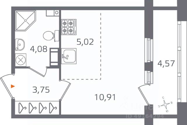 1-комн. квартира-студия от застройщика с отделкой в ЖК "ORO by Akvilon" на 3 этаже. Общая площадь: 24.37 кв.м., площадь гостиной 14.41 кв.м., из которых 5.61 кв.м. выделено под кухонную зону. Все окна выходят на одну сторону. В квартире одна лоджия, один совмещенный санузел. Высота потолков 2.85 м.