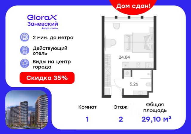 Продается апартамент-студия на 13-м этаже в сданном Апарт-комплексе бизнес-класса "GloraX Заневский". Ключи сразу! Общая площадь лота составляет 22,07 кв. м, из которых 18,92 кв. м отведено под жилую. Номер апартамента - 1 343. Преимущества: - Полная чистовая отделка - Возможность покупки меблировка и техника - Вход по ключ-карте - Прачечная на 1 этаже - Возможность дозаказа отельного сервиса - Программы доходности - Летний бар и променад - Воркаут площадка - Pet-friendly Апартаменты "GloraX Заневский" - проект бизнес-класса с развитой инфраструктурой, удовлетворяющей все потребности самых взыскательных гостей. Располагается в одном из наиболее перспективных, районов Петербурга в 2х минутах от метро "Ладожская" и в 10 минутах от Невского проспекта. В "GloraX Заневский" есть все, что необходимо для комфортной жизни, работы и отдыха. Инфраструктура, покрывающая все потребности и ожидания собственников и арендаторов. В радиусе 150 метров находятся супермаркеты с возможностью доставки продуктов прямо до дверей апартаментов. На 1000 кв. м. общественных пространств расположится уютный лобби-бар, ресторан мировой кухни на 80 человек и оборудованные коворкинги. В апартаментах "GloraX Заневский" выполнена современная отделка с использованием высококачественных экологичных материалов. В проекте предусмотрен подземный отапливаемый паркинг на 100 мест, куда можно спуститься на лифте прямо от дверей апартаментов. Цена указана при 100% оплате или стандартной ипотеке. Узнайте подробности в Отделе продаж.