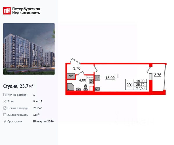 Продается просторная студия от застройщика в жилом комплексе "Бионика Заповедная" в динамичном Приморском районе. До метро можно добраться на транспорте всего за 11 минут. Удобная, классическая, функциональная европланировка, просторная прихожая 3.7 м². Общая площадь студии - 25.7 м², жилая 18 м², высота потолка 2.77 м. Квартира продается с отделкой "NORD LINE WHITE ВК NEW". Что особенного в ЖК "Бионика Заповедная"? • Оазис в городе 3 минуты пешком до Новоорловского заказника (140 ГА) • Захватывающие виды из окон на хвойный лесопарк • Всесезонный "Заповедный парк" во дворе площадью 23000 кв.м. • 5 единых входных групп с авторским дизайном и лаундж-зонами, сити-виллы на первых этажах с палисадниками и высотой потолков до 4 м • Места притяжения: фонтан "Бионика", спортивный кластер со скейт-парком, фотозоны с арт-объектами