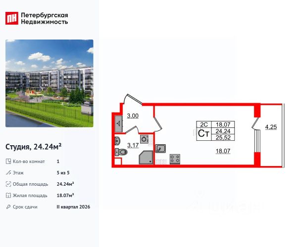 • Студия, общая площадь — 25,94 м² (по планировке) — компактно, современно, удобно.