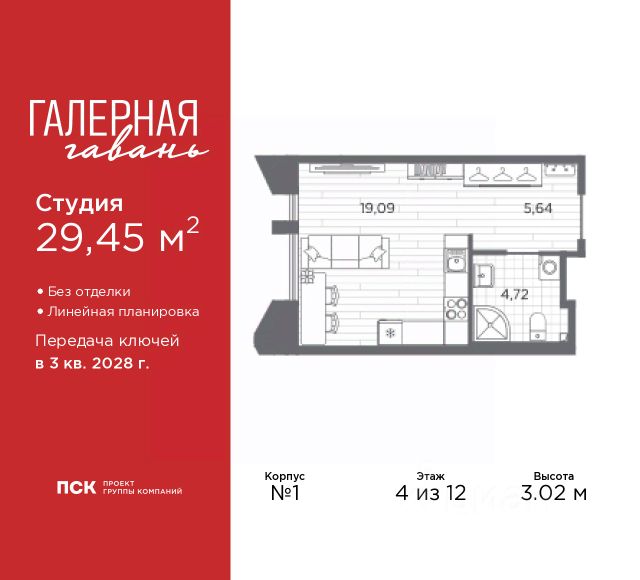 Старт продаж нового ЖК на Васильевском! Звоните, наши менеджеры вам все расскажут! Просторная однокомнатная квартира-студия в ЖК "Галерная гавань" на 9 этаже. Квартира без отделки, после получения ключей можно делать ремонт. Общая площадь: 29.45 кв.м., площадь гостиной 19.09 кв.м., из которых 5 кв.м. выделено под кухонную зону. Все окна выходят на одну сторону. В квартире один совмещенный санузел. Высота потолков 3.02 м. "Галерная гавань" — это жилой комплекс бизнес-класса в исторической части Васильевского острова — на берегу Галерной гавани, ведущей свою историю с 1724 года. В свою очередь, исторический Васильевский остров это университеты, школы, детские сады, поликлиники, несколько станций метро и прочая инфраструктура без проблем с транспортной доступностью. В "Галерной гавани" шесть корпусов на 813 квартир, площадью от 29,5 до 134 кв.м. Высота потолков 3 м. Два корпуса из шести всего на 20 квартир. На верхних этажах расположатся квартиры с большими террасами и панорамным остеклением. Также есть квартиры с французскими балконами и мастер-спальнями. Четыре квартиры из каждых пяти с видами из окон на тихую воду, на старые и новые городские символы. Паркинг займет весь подземный объем квартала, и будет вмещать 606 автомобилей. Фасады "Галерной гавани" выполняются в стиле баварской кирпичной кладки, с акцентами из керамогранита графитового оттенка. Объемы задаются ризалитами с художественной подсветкой. Для жителей будет создан комьюнити-клуб с переговорной и библиотекой, кинозалом, кофе-поинтом, детской комнатой с пространством для мастер-классов, фитнес-зоной, а также бьюти-кабинетом. "Галерная гавань" — это также первый в Петербурге жилой комплекс с общественным пространством у воды. ГК "ПСК" восстановит десять исторических зданий, в которых расположатся рестораны, кафе, фитнес-клуб с бассейном, культурное пространство, театр и офисы. При этом набережная будет превращена в пешеходную, в территорию общественного пространства. #ZM9C1S