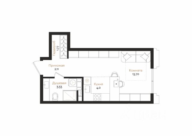Правильная квадратная геометрия - редкость для студий. Здесь пространство гибкое: приватная спальня у окна, евро-планировка или просторный open-space - выбор за вами.