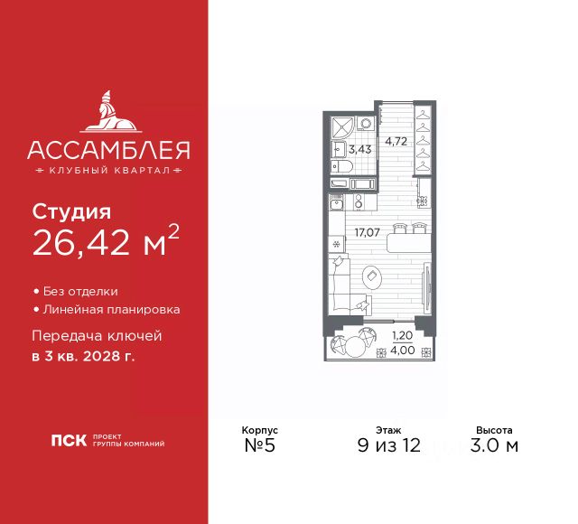 Просторная однокомнатная квартира-студия в Клубный квартал "Ассамблея" на 9 этаже. Квартира без отделки, после получения ключей можно делать ремонт. Общая площадь: 26.42 кв.м., площадь гостиной 17.07 кв.м., из которых 5 кв.м. выделено под кухонную зону. Все окна выходят на одну сторону. В квартире один балкон, один совмещенный санузел. Высота потолков 3.0 м.