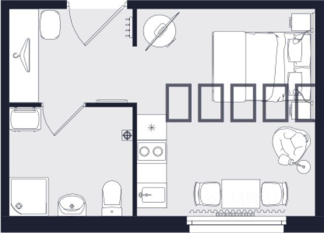 Общая площадь студии составляет 24,7 м2, кухня-гостиная 16,4 м2, прихожая 2,7 м2, совмещенный санузел площадью 3,5 м2 и просторная лоджия с панорамным остеклением и морозостойким вместительным шкафом для хранения площадью 2,1 м2.