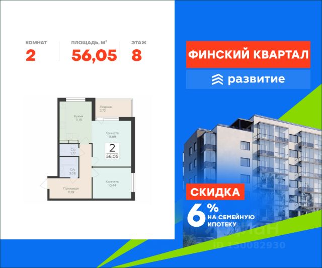 Продается квартира площадью 56.05 кв. м с отделкой white box. Квартира расположена на 8 этаже 8 этажного дома, в жилом комплексе комфорт-класса "Финский Квартал". "Финский квартал" - это уникальный проект комфорт-класса для тех, кто хотел бы жить на природе, но при этом находиться вблизи Северной столицы. Расположенный в окружении одного из самых крупных парков Ленобласти - Лахтинского, проект предлагает своим жителям доступную инфраструктуру, комплексное благоустройство территории, 6 секций переменной этажности с современной архитектурой, которая гармонично дополнит район и будет радовать проживающих еще много лет. Найдите свою идеальную квартиру в ЖК "Финский Квартал"! Расположение Пешком: - 5 мин. до детского сада и супермаркета; - 8 мин. до остановки "Зеленая улица"; - 10 мин. до лесопарковой зоны. На автомобиле: - 3 мин. до Приозерского шоссе; - 10 мин. до Выборгского шоссе; - 12 мин. до КАД; - 30 мин. до ст. метро "Проспект Просвещения". Благоустройство - большой яркий двор с ландшафтным дизайном; - живая изгородь, кустарники и хвойники; - умное зонирование тихих и активных площадок; - сквер для прогулок и отдыха; - изумрудные лужайки для пикников; - дорожки для пешеходов и велосипедистов; - большие игровые площадки; - мягкое покрытие для безопасности детей; - тренажеры, турники и веревочные комплексы; - пространство только для пешеходов - без машин; - наземная парковка за пределами двора; - специальные площадки для выгула питомцев; - светлые дизайнерские холлы; - светопрозрачное остекление и большие окна; - декоративная подсветка парадных; - колясочные помещения для комфорта родителей; - места для хранения велосипедов и самокатов. Окружение - свежий воздух: парк усадьбы "Осиновая Роща", Лахтинский парк, лесопарк "Курортный", Левашовский заказник, Ново-Кавголовский лесопарк; - водные объекты: Сестрорецкий Разлив, пляжи у Тохколодского и Большого озер, залив Сярюнлахти; - инфраструктура: 2 детских сада, школа, кафе, продуктовый супермаркет, больница; - для крупных покупок: ТРЦ "Китай-Город", "Мега-Парнас"", "Гранд Каньон"; - активный отдых: горнолыжные комплексы "Охта-Парк" и "Токсово", конный клуб "Осиновая Роща", ФОК "Норус".