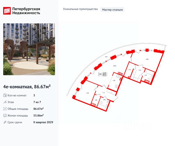 Окна выходят на две стороны: две комнаты с панорамным остеклением — в сторону Невы и ЖК Империал, кухня-гостиная — в тихий благоустроенный двор.