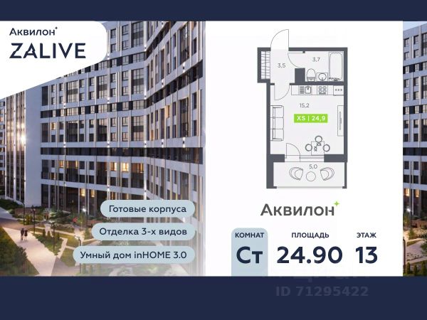 Купи квартиру в ЖК "Аквилон ZALIVE"! Отделка В квартире выполнена предчистовая отделка WhiteBox +Возможен дозаказ отделки в любом из 3 цветов: SAND, TERRA, GRAPHITE Отделка входит в стоимость квартиры в ДДУ ЖК "Аквилон ZALIVE" Жилой комплекс "Аквилон ZALIVE" расположился в уникальной части престижного Васильевского острова. С одной стороны рядом деловой и исторический центр, с другой берег Финского залива и новая современная инфраструктура в пешей доступности. Проект включает в себя пять тринадцатиэтажных "умных" домов в едином архитектурном стиле. Насыщенная социальная инфраструктура, инновации в каждой квартире, стильное благоустройство территории и видовые характеристики это лишь часть уникальных преимуществ жилого комплекса "Аквилон ZALIVE". -Малошумные лифты -Сквозные парадные -Светопрозрачные входные группы -Школа во дворе -Безбарьерная среда -Паркинг Стандарты Группы Аквилон для вашей комфортной жизни Thermo-S экономия на коммунальных платежах за счет дополнительно утепленных стен, кровли и цоколя. Энергоэффективные окна с селективным покрытием и аргоновым заполнением Soundstop - дополнительная шумоизоляция внутренних перегородок и межэтажных перекрытий, шумозащитные окна, малошумные лифты Light-in - в квартирах устанавливаются широкоформатные окна, увеличены на 30%. Высота подоконников на уровне 60 см от пола. Vent-in - в каждой комнате есть клапаны индивидуальной вентиляции, которые обеспечивают приток свежего воздуха с улицы. inHOME умный дом в каждой квартире Интеллектуальная цифровая система, которая позволит дистанционно решать бытовые вопросы, управлять квартирой и экономить на оплате коммунальных услуг. В состав inHOME входят: IP-домофон, Face key, "умные" счетчики, датчики протечки, дистанционное отключение розеток, и т.д. Двор ваш личный парк Для разработки проекта благоустройства и озеленения Группа Аквилон привлекла студию DEREVO PARK, которую ассоциация ландшафтных архитекторов России четыре года подряд признавала лучшей. Два хвойных сада, расположенные вдоль западной стороны квартала, станут визитной карточкой ЖК "Аквилон ZALIVE". Локация и инфраструктура Васильевский остров это море и прогулки, Санкт-Петербургский Государственный Университет и Ростральные колонны, музей современного искусства "Эрарта" и концептуальное пространство "Севкабель Порт". Достаточно переехать через мост и вот вы уже в центре или на Петроградской стороне. - 7 мин. до развязки ЗСД -12 мин. до м. Приморская -15 мин. до м. Невский проспект #25Cf9V