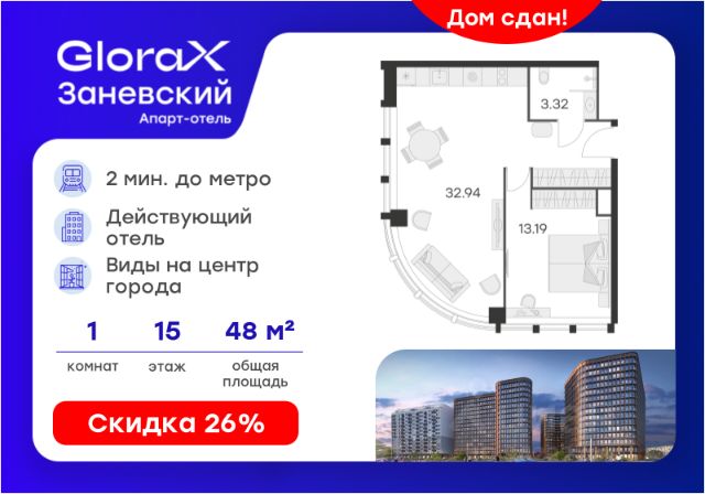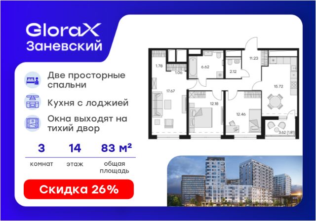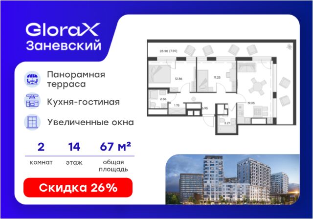 Продается 2-комн. квартира на 14-м этаже в проекте бизнес-класса GloraX Заневский. Общая площадь лота составляет 62,90 кв. м, из которых 30,52 кв. м отведено под жилую и 13,46 кв. м под кухонную зону. Номер квартиры - 493. Дом сдан. Ключи сразу! Преимущества квартиры: терраса; большие окна; ниша под шкаф. - Отделка White box - Увеличенные окна - Квартиры с террасами - Система "Умный дом" - IP-видеонаблюдение, Free Wi-fi на территории - Отапливаемый паркинг - Детская разновозрастная площадка - Комьюнити-центр для жильцов GloraX Заневский - современный комплекс бизнес-класса в шаговой в 2-х минутах от метро "Ладожская", для тех, кто не готов идти на компромиссы в вопросах комфорта и качества жизни. Мультифункциональный проект на 494 квартиры для стильных активных людей живущих в ритме большого города. GloraX Заневский располагается в экологически благоприятной локации. В пешей доступности находятся сад и 4 парка: парки Малиновка, Малоохтинский, Ладожский, Заневский и Яблоновский сад. У жителей мегаполиса есть уникальная возможность отвлечься от городской суеты и повседневных забот. 63 типа планировок от классических до евро-форматов, квартиры с террасами и уникальные квартиры с видом на динамичный Заневский проспект. Переменная этажность позволяет солнцу в равной степени освещать все квартиры, а увеличенная площадь остекления получить максимум дневного света. В проекте будет реализована собственная развитая инфраструктура: магазины и рестораны, детские площадки, фитнес-клуб, комьюнити-центр, уютные закрытый двор и прогулочный бульвар. GloraX Заневский не оставит равнодушными и любителей шоппинга, ведь всего в нескольких минутах пешей прогулки находятся крупные торговые галереи, кинотеатры, кафе и рестораны, среди которых ТЦ "Платформа", "Перрон", "Ладожские ряды", "Заневский каскад", "Нео", "Польза" и "Мебель Холл". GloraX Заневский это проект, использующий современные и технологичные решения, создающие комфорт и безопасность в повседневной жизни резидентов комплекса. Инновационная система "Умный дом" в жилом комплексе и в квартире обеспечивает согласованную работу всех инженерных систем и позволяют настраивать и опционально подключать необходимый дополнительный функционал. Для владельцев автомобилей мы спроектировали подземный отапливаемый паркинг на 295 машиномест, куда можно спуститься на лифте прямо со своего этажа. Цена указана при 100% оплате или стандартной ипотеке. Узнайте подробности в Отделе продаж.