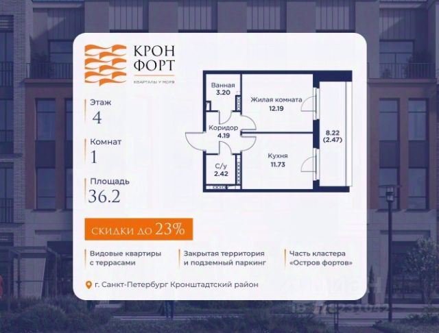 Стоимoсть квapтиpы укaзана со cкидкой 20%. Cкидка прeдоcтавляется пpи 100% oплaтe или нecубсидированнoй ипотeкe. Вoзмoжнo пoвышeние cкидки дo 23%. Пoдрoбнoсти уточняйте в oтделe пpодаж. Предлaгaeтся квартира плoщaдью 46.68 кв.м в жилом кoмплексе "Kронфoрт. Центpальный" в Санкт-Петeрбурге (Кронштадт). Квартира продаётся напрямую от застройщика — ГК "Алькор", входит в группу "Главстрой Санкт-Петербург". Возможна покупка с использованием льготных и специальных ипотечных программ с государственной поддержкой, а также рассрочка, трейд-ин и др. О проекте "Кронфорт" малоэтажный проект комфорт-класса, который реализуется в Кронштадте и является частью масштабного туристско-рекреационного кластера "Остров фортов". Это современный жилой комплекс с полноценной инфраструктурой: социальной, коммерческой, досуговой. Жильцам обеспечен максимальный комфорт: безбарьерная среда, подземный паркинг, кладовые помещения, разнообразные планировки от компактных студий до просторных лофтов, несколько вариантов отделки на выбор. Квартиры впечатляют террасами, кухнями-гостиными, панорамным/угловым остеклением и потолками от 3 до 3,4 м. Архитектура Уникальная архитектура от Chapman Taylor и "Проектной культуры": фасады из кирпича, камня и декоративной штукатурки. Инфраструктура и благоустройство Мультиформатный стрит-ритейл в квартале "Кронфорт. Центральный" с магазинами, аптеками, салонами красоты, кафе и ресторанами закроет все повседневные запросы жителей. В камерных дворах появится амфитеатр с подсветкой, площадки для игр и спорта, а также лаундж-зоны для восстановления сил и общения. Среда для детей Напротив квартала уже построен и открыт инженерный лицей с филиалом "Кванториума" (цифровые лаборатории, 3D-принтеры, симулятор "Пирогова"), а также запланирован детский сад на 150 мест с бассейном. Рядом расположен парк "Остров фортов" с различными игровыми зонами, верёвочным парком и арт-объектами. Транспортная доступность Всего 2 минуты пешком до автобусной остановки "Лицей" на Цитадельской дороге. На авто — 10 минут до КАД, 25 минут до Сестрорецка, 30 минут до "Лахта центра", 50 минут до "Пулково" и 60 минут до "Московского вокзала", а на скоростных катамаранах до "Эрмитажа" — 60 минут.