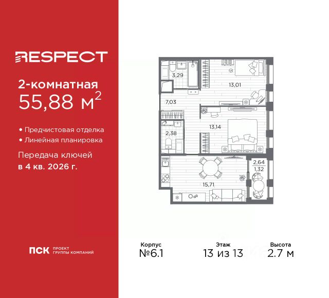 1-комн. квартира с предчистовой отделкой в ЖК "RESPECT" на 13 этаже. Общая площадь: 38.09 кв.м., жилая: 11.58 кв.м., площадь просторной кухни-столовой: 16.47 кв.м. Все окна выходят на одну сторону. В квартире один балкон, один совмещенный санузел. Высота потолков 2.7 м. Дом монолитный, многоподъездный, переменной этажности, от 8 до 13 этажей. Квартира находится в 1-й секции высотой 13 этажей в корпусе 2. На этаже 5 квартир. В подъезде 1 пассажирский и 1 грузовой лифт. Окончание строительства - 1 квартал 2026 года. Оформление сделки по договору долевого участия. В шаговой доступности от жилого комплекса расположены станции метро (расстояние по прямой): "Лесная" (800 м), "Площадь Мужества" (1.4 км), "Выборгская" (1.9 км), также недалеко от этого корпуса расположены станции метро: "Академическая", "Политехническая". Жилой квартал "RESPECT" строится на Полюстровском пр, 87, в одной из самых востребованных локаций Петербурга. В 10 минутах пешком - метро "Лесная" и в 10 минутах на транспорте - Петроградская сторона. Высота домов от 7 до 13 этажей. Квартиры сдаются с отделкой white box и с чистовой отделкой. На территории Respect строится школа на 1125 учащихся и детский сад на 240 мест. Запроектированы собственная газовая котельная, закрытая территория, дворы без машин и подземные паркинги с лифтами. В проекте предусмотрены трапециевидные балконы или остекленные лоджии, которые, с одной стороны, исключают монотонность фасада, являясь декоративными элементами, с другой дополнительным функциональным пространством в квартирах. Цветовая гармония фасадов каждого дома раскрывает характер квартала. Коричневый цвет клинкерного кирпича со структурой водяных штрихов — цвет уюта и безопасности, сдержанности и надёжности. Вентилируемые фасады облицованы клинкерным кирпичом. Его высокая прочность позволяет давать 100 лет гарантии на этот материал. Водопоглощение клинкерного кирпича составляет менее 5%, за счет чего у него высокая теплопроводность и прочность. В квартале запроектированы внутренние закрытые территории дворов домов без доступа автомобилей и безбарьерная среда для велосипедистов и колясок. Предусмотрены IP-домофония с функцией дистанционного открывания калиток и парадных, а также дистанционный сбор показаний счетчиков и мобильное приложение для жителей. Для безопасности жителей квартала - круглосуточное видеонаблюдение и служба охраны. В каждой квартире предусмотрены внешние корзины для кондиционеров. Вся территория квартала будет связана единой концепцией благоустройства, разработанной ландшафтным бюро L.BURO. На эксплуатируемой кровле на уровне первого этажа в домах 1 и 4 будут обустроены общественные видовые террасы. Это станет не только привлекательным местом с красивым видом, но и удобным, многофункциональным пространством. Дизайн парадных зон и входных групп - сочетание лаконичности отделки и декоративных элементов с текстурами из натурального камня и дерева с приглушенной подсветкой теплым светом. Во входных группах распо