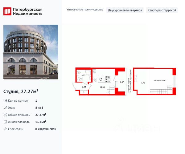 Главное преимущество — собственная приватная терраса 11,6 м², отделанная лиственницей сорта Экстра. Южная сторона, открытый вид без близлежащих окон, уличная мебель и кокон-качель, выведено электричество. Это Ваш личный оазис в центре города: идеален для отдыха, летних завтраков, чтения или камерных встреч с близкими.