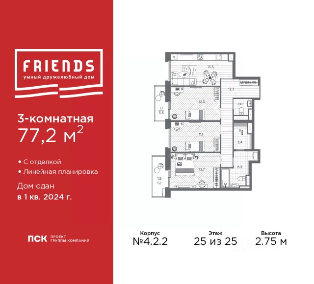 4 этажа, 4 комнаты + кухня-гостиная 32 м², 3 санузла, 2 гардеробные.