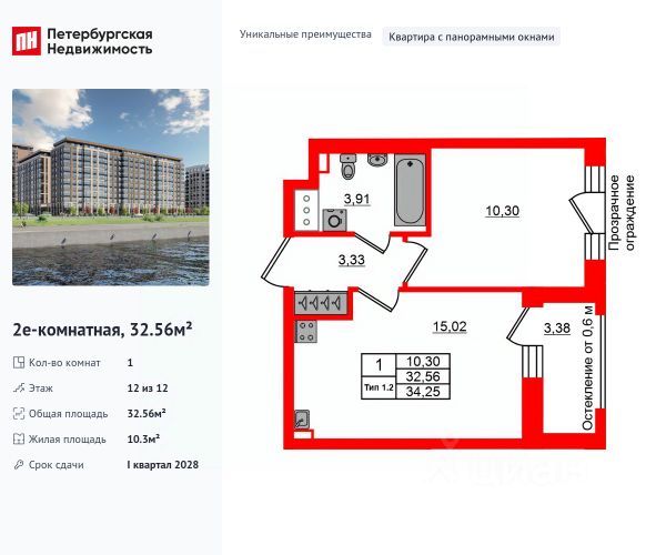 - Общая площадь квартиры 30,3 кв. м.