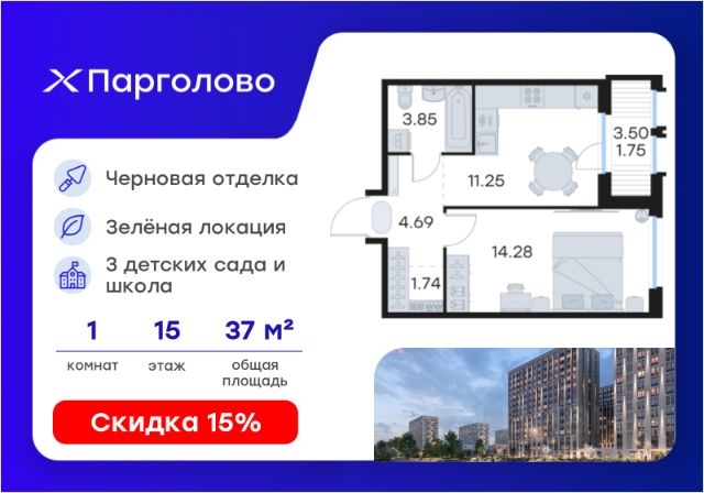 Продается 1-комн. квартира на 15-м этаже в проекте комфорт-класса Парголово. Общая площадь лота составляет 32,93 кв. м, из которых 10,15 кв. м отведено под жилую и 13,98 кв. м под кухонную зону. Номер квартиры - 144. Преимущества: - Квартира комфорт-класса - Зеленый район, Шуваловский парк в 20 мин. пешком - 10 мин. до КАД, 15 мин. до ЗСД - 5 эт. паркинг на 451 м/м - Закрытые дворы с видеонаблюдением - Детские площадки с геопласткой и бизиборадми - Сады и школы в шаговой доступности - Спортивные площадки и велодорожки - Собственный комьюнити-центр - Келлеры для хранения - Коммерческие помещения на 1 этажах Парголово — масштабный проект комфорт-класса в Выборгском районе Санкт-Петербурга девелопера GloraX. Место, продуманное до мелочей, где все, что необходимо — рядом. Архитектурно-пространственное решение отличается лаконичностью и строгостью и придает проекту свой характер. Внутренние дворы закрыты от внешнего мира, создавая приватную территорию для жителей. Живите на природе, но с комфортом мегаполиса. Десять минут на велосипеде или полчаса пешком — и вы окажетесь в одном из культовых мест отдыха петербуржцев: Шуваловском парке, Орловском заказнике с их чистыми карьерами или на Суздальских озерах. До ж/д станции "Парголово" 7 минут на автомобиле, до метро Проспект Просвещения 25 минут, КАД 10 минут, ЗСД 15 минут. В шаговой доступности остановка общественного транспорта. В шаговой доступности — собственные школы и детские сады. Здесь все создано для максимального комфорта каждого жителя. Приватное пространство внутреннего двора с беседками с розетками для работы и отдыха, зеленый двор с уютным многоуровневым освещением, детскими эко-площадками и спортивными площадками создает неповторимую атмосферу, заряжающую энергией на новые свершения. Квартиры сдаются без отделки. Узнайте подробности в Отделе продаж.
