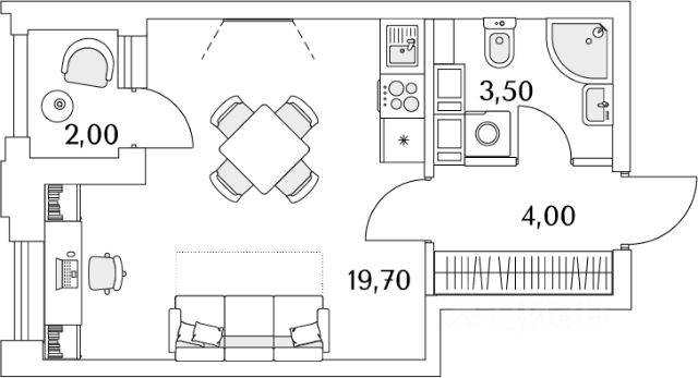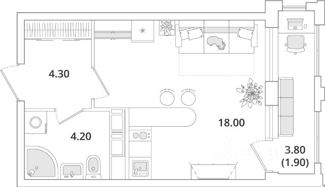 •зона кухни соединена с маленькой комнатой, при желании можно выставить перегородку, постоянную или раздвижную.