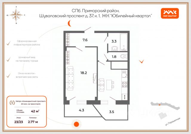 Арт. 117219492 Актуальный лот от проверенного застройщика: Приморский район — это локация с сформировавшейся инфраструктурой. Здесь магазины, школы и детские сады, удобная транспортная доступность, несмотря на временное отсутствие станции метро в пешей близости. Одним словом комфорт! Дом КИРПИЧНЫЙ, введён в 2012 году. ЛенСпецСМУ. Гостевая стоянка со шлагбаумом, подземный паркинг, детские и спортивные площадки, разнообразные коммерческие сервисы. Тут есть буквально всё. Ухоженная входная группа с видеонаблюдением, 3 лифта ( 2 из них грузовые). Сама квартира находится на комфортном 23 этаже. Этаж верхний, но над ним технический уровень и чердак! Квартира очень светлая и тёплая. Окна на ВОСТОК, отличный обзор на панораму города. Благодаря высокому этажу вы забудете, что такое уличный шум и пыль! Продуманная эргономичная планировка включает в себя : светлую комнату 18 м²; кухню, правильной квадратной формы 11 м²; вместительные санузлы; большую гардеробную у входа, оснащённую модульной системой хранения; и изюминка, конечно, — одновременное наличие открытого балкона и утеплённой, застеклённой лоджии. В квартире сделан современный ремонт, износ минимальный. Всё оснащение мебель и техника остаётся новым владельцам в качестве бонуса! Никто не зарегистрирован. Один взрослый собственник, владеющий квартирой свыше 10 лет. Простая, прозрачная сделка. Оперативные показы ключи у агента. До встречи на просмотре!Предлагаем ПРЕМИАЛЬНОЕ обслуживание для требовательных клиентов. Оперативно организуем просмотр, предоставим полную информацию по объекту. 20 лет работы с требовательными клиентами подготовили нас к решению ВАШИХ сложных задач. Будем рады знакомству! Ул. Рубинштейна, д.8.