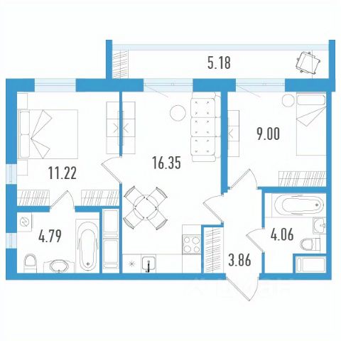 - три изолированные комнаты: 17,3 м2, 16,2 м2 и 11, 9 м2;