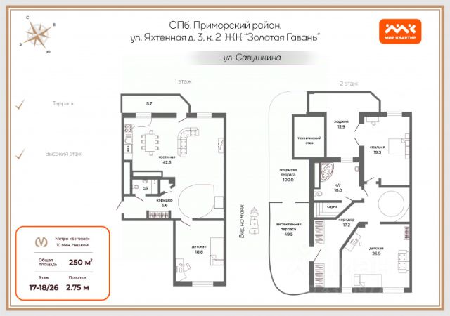 Арт. 127425359 В продаже четырехкомнатная квартира-пентхаус, представляющая собой уникальный лот по своему содержанию и исполнению. Выгодное расположение в благоустроенной, перспективной и привлекательной локации Северной Столицы. Фактическая площадь квартиры составляет около 250 м2, включая террасу площадью около 100м2. Квартира находится в непосредственной близости от Набережной реки Невки окружении водоемов и парков (Парк 300-летия Санкт-Петербурга, ЦПКиО им. Кирова (Елагин Остров)) и непосредственной близости от Финского Залива. В шаговой доступности располагается Приморский парк Победы (Крестовский остров) и небоскреб "Лахта Центр". ЖК "Золотая Гавань"- излюбленный Петербуржцами жилищный комплекс бизнес-класса от надежного застройщика АО "Эталон ЛенСпецСМУ" в Приморском районе с благоприятной экологией и развитой инфраструктурой. Квартира расположена на двух верхних этажах монолитно-кирпичного дома 2007 года постройки, соединенных изящной винтовой лестницей, редким преимуществом служит выход на открытую террасу -приватную кровлю площадью около 100 квадратных метров. Наличие такого пространства позволяет любоваться закатами, принимать воздушные и солнечные ванны с высоты птичьего полета. Вблизи комплекса расположен выезд на скоростную магистраль "ЗСД". Преимущества/удобства: *10 минут пешком до станции метро "Беговая" * консьерж, видеонаблюдение * подземный паркинг * Современный детский сад во дворе * Вблизи гимназии, школы, спортивные школы, школы искусств, фитнес-клубы, торгово-развлекательные центры, гипермаркеты. Редчайшее предложение в жилом комплексе, в настоящее время единственное в своем роде на рынке. Звоните! Оперативно предоставим информацию. Организуем просмотр по предварительной записи. Рассмотрим обмен на иную недвижимость. Предлагаем ПРЕМИАЛЬНОЕ обслуживание для требовательных клиентов. Оперативно организуем просмотр, предоставим полную информацию по объекту. 20 лет работы с требовательными клиентами подготовили нас к решению ВАШИХ сложных задач. Будем рады знакомству! Ул. Рубинштейна, д.8.