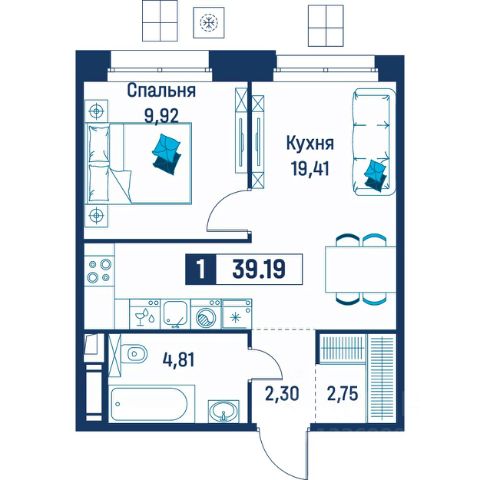 Продаётся 1-комнатная квартира в строящемся доме (Корпус 6), срок сдачи: III-кв. 2029, общей площадью 39.19 кв.м., на 16 этаже.