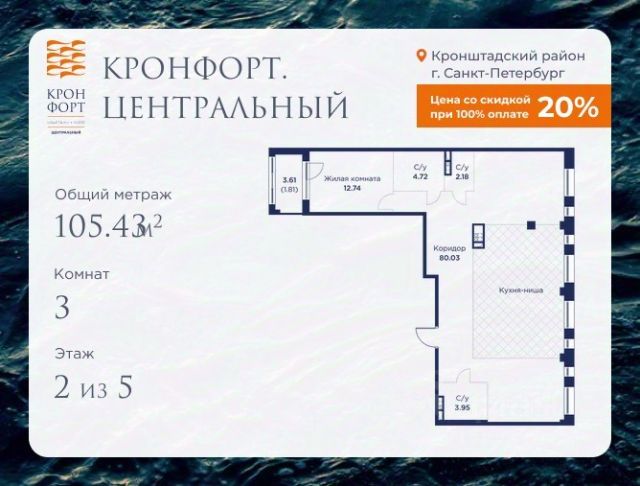 Стоимость квартиры указана со скидкой 20%. Скидка предоставляется при 100% оплате или несубсидированной ипотеке. Предлагается квартира площадью 105.43 кв.м в жилом комплексе "Кронфорт. Центральный" в Санкт-Петербурге (Кронштадт). Возможна покупка с использованием льготных и специальных ипотечных программ с государственной поддержкой. Высота потолков в квартирах — от 3 до 3,4 метров, окна увеличенного размера, есть варианты с эркерами, французскими балконами, лоджиями и террасами. Жилой квартал состоит из пяти четырехэтажных корпусов с закрытыми охраняемыми дворами, свободными от машин. Первые этажи формируют торговые променады в стиле пешеходных улиц исторической части Петербурга и Кронштадта. Внутренние пространства между корпусами — пешеходные зоны с уютными площадями. Архитектурный облик квартала разработан бюро "Проектная культура" и международной компанией Chapman Taylor. Инфраструктура комплекса включает: - Лицей с двумя бассейнами - Детский сад на 150 мест с бассейном и закрытой территорией - Веревочный парк - Игровые площадки для активного отдыха; - Кабинет врача общей практики. - Подземные паркинги с лифтами. - Мусоросборные камеры, индивидуальные кладовые. - Закрытые дворы с контролем доступа и видеонаблюдением. - Мультформатный стрит-ретейл с кафе и ресторанами. - Триатлон-центр и беговые/велодорожки. - Учебно-тренировочный комплекс для детей "Лагерь настоящих героев". Транспортная доступность обеспечивает удобный выезд на КАД (около 1-3 км), 2 минуты пешком до автобусной остановки "Лицей", 25 минут до Сестрорецка, 30 минут до "Лахта-центра", 50 минут до аэропорта "Пулково" и 60 минут до Московского вокзала. Для любителей моря доступен маршрут на "Метеоре" до центра Санкт-Петербурга. Отделка квартир предлагается как с готовой чистовой отделкой, так и со свободной планировкой без отделки для реализации индивидуальных дизайнерских решений. В третьем корпусе, продажи которого стартовали в марте 2025 года, доступны квартиры с просторными террасами, тремя балконами, кухнями-гостиными до 38 кв.м с окнами на две стороны, обеспечивающими панорамное освещение и виды. Если вам нужна помощь с оформлением ипотеки или дополнительная информация по комплексу и условиям покупки, обращайтесь в отдел продаж за консультацией. Купить квартиру в новостройке без отделки в Кронштадте.