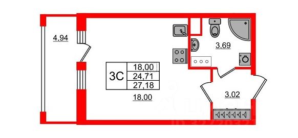 Общая площадь квартиры составляет 31,77 м.