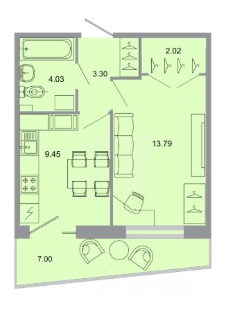 -Просторная кухня-гостинная-15.14 м.кв. с выходом на застеклённую лоджию - 3.62 м.кв. Уютная комната - 11.74 м.кв. Площадь прихожей 4.23 м.кв.