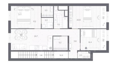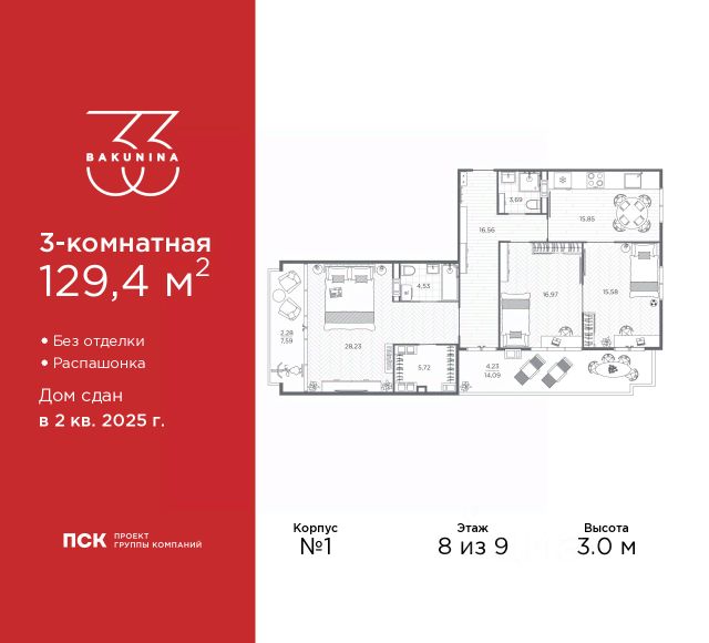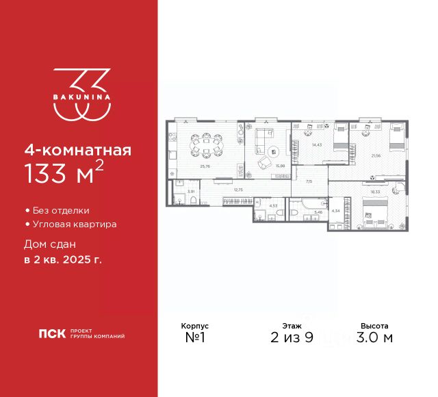 Продается четырехкомнатная квартира от застройщика в ЖК "BAKUNINA 33" на 9 этаже. Квартира без отделки, полностью готова к ремонту. Общая площадь: 150.8 кв.м., жилая: 87.05 кв.м., площадь просторной кухни-столовой: 17.31 кв.м. Квартира без проходных комнат, окна выходят нa три cтopoны дома. В квартире три балкона, три совмещенных санузла. Высота потолков 3.0 м. Дом монолитный, трехподъездный, высотой 9 этажей. Квартира находится во 2-й секции в корпусе 1. На этаже 5 квартир. В подъезде 1 пассажирский и 1 грузовой лифт. Начало строительства - 2 квартал 2023 года. Строительство окончено, дом сдан во 2 квартале 2025 года. Оформление сделки по договору купли-продажи. В шаговой доступности от дома расположены станции метро (расстояние по прямой): "Площадь Александра Невского" (700 м), "Площадь Александра Невского 1" (700 м), "Площадь Александра Невского 2" (800 м), "Площадь Восстания" (1.4 км), "Новочеркасская" (1.5 км), также недалеко от этого корпуса расположены станции метро: "Владимирская", "Чернышевская", "Ладожская". Клубный дом BAKUNINA 33 - новый стандарт престижной жизни в Центральном районе. В 10 минутах от Невского проспекта и в двух минутах от Синопской набережной и Невы, в благоустроенной и знакомой среде. Локация клубного дома Bakunina 33 - идеальное место для погружения в культурную и светскую жизнь Санкт-Петербурга. В 10-15 минутах на машине почти все знаковые достопримечательности города: Эрмитаж, Русский музей, Александринский и Мариинский театры, БДТ, Таврический парк Казанский собор, Спас на крови и другие величественные дворцы, соборы, музеи, ради которых в город ежегодно съезжаются тысячи гостей. Каждая линия и каждый элемент дизайна дома является частью целостной концепции. Облик здания гармоничный, классически сдержанный с выверенными пропорциями и элегантными формами. Цветовые и архитектурные решения и эркеры придают облику дома легкость, доступную лишь респектабельной классике. Фасады привлекают внимание плавными ритмичными переходами. Вертикальная разбивка колоннами визуально устремляет здание ввысь. Плоскость фасадов декорирована разными элементами из гранита. Ограждение балконов, эркеры и колонны дополнены лаконичным геометрическим орнаментом в акцентном теплом сером цвете. Первые два этажа дома облицованы натуральным гранитом тёмного оттенка. Основной объём здания - выполнен штукатурным фасадом с окраской светлыми тонами из цветовой палитры " Традиционные цвета Санкт-Петербурга". Верхний этаж выполнен в стиле мансарды с высотой потолков в квартирах 3,5 метра. Этим достигается цель гармоничного и сомасштабного существования в одном фронте с существующими зданиями. За венчающим карнизом располагаются балконы девятого этажа. Ограждения балконов дополнены геометрическими узорами. Закрытый внутренний двор со сквером и детской площадкой. Острова зелени с водной чашей в центре создают ощущение гармонии и умиротворения. Современная уличная мебель и освещение формируют домашнюю атмосферу уюта и представляют квартира в готовой новостройке в районе Центральный в Санкт-Петербурге.