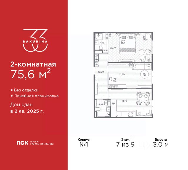 Продается двухкомнатная квартира в ЖК "BAKUNINA 33" на 7 этаже. Квартира без отделки, новый собственник может сделать ремонт по индивидуальному проекту. Общая площадь: 75.6 кв.м., жилая: 38.73 кв.м., площадь просторной кухни-столовой: 18.79 кв.м. Комнаты изолированные, все окна выходят на одну сторону. В квартире два совмещенных санузла. Высота потолков 3.0 м. Дом монолитный, трехподъездный, высотой 9 этажей. Квартира находится во 2-й секции в корпусе 1. На этаже 5 квартир. В подъезде 1 пассажирский и 1 грузовой лифт. Начало строительства - 2 квартал 2023 года. На сегодняшний день строительство завершено, дом сдан во 2 квартале 2025 года. Оформление сделки по договору купли-продажи. В шаговой доступности от дома расположены станции метро (расстояние по прямой): "Площадь Александра Невского" (700 м), "Площадь Александра Невского 1" (700 м), "Площадь Александра Невского 2" (800 м), "Площадь Восстания" (1.4 км), "Новочеркасская" (1.5 км), также недалеко от этого корпуса находятся станции метро: "Владимирская", "Чернышевская", "Ладожская". Клубный дом BAKUNINA 33 - новый стандарт престижной жизни в Центральном районе. В 10 минутах от Невского проспекта и в двух минутах от Синопской набережной и Невы, в благоустроенной и знакомой среде. Локация клубного дома Bakunina 33 - идеальное место для погружения в культурную и светскую жизнь Санкт-Петербурга. В 10-15 минутах на машине почти все знаковые достопримечательности города: Эрмитаж, Русский музей, Александринский и Мариинский театры, БДТ, Таврический парк Казанский собор, Спас на крови и другие величественные дворцы, соборы, музеи, ради которых в город ежегодно съезжаются тысячи гостей. Каждая линия и каждый элемент дизайна дома является частью целостной концепции. Облик здания гармоничный, классически сдержанный с выверенными пропорциями и элегантными формами. Цветовые и архитектурные решения и эркеры придают облику дома легкость, доступную лишь респектабельной классике. Фасады привлекают внимание плавными ритмичными переходами. Вертикальная разбивка колоннами визуально устремляет здание ввысь. Плоскость фасадов декорирована разными элементами из гранита. Ограждение балконов, эркеры и колонны дополнены лаконичным геометрическим орнаментом в акцентном теплом сером цвете. Первые два этажа дома облицованы натуральным гранитом тёмного оттенка. Основной объём здания - выполнен штукатурным фасадом с окраской светлыми тонами из цветовой палитры " Традиционные цвета Санкт-Петербурга". Верхний этаж выполнен в стиле мансарды с высотой потолков в квартирах 3,5 метра. Этим достигается цель гармоничного и сомасштабного существования в одном фронте с существующими зданиями. За венчающим карнизом располагаются балконы девятого этажа. Ограждения балконов дополнены геометрическими узорами. Закрытый внутренний двор со сквером и детской площадкой. Острова зелени с водной чашей в центре создают ощущение гармонии и умиротворения. Современная уличная мебель и освещение формируют домашнюю атмосферу у