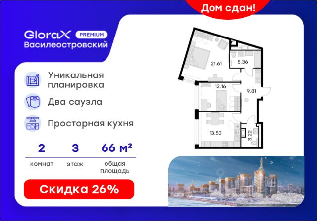 Продается 2-комн. квартира на 3-м этаже в сданном проекте премиум-класса GloraX Premium Василеостровский. Общая площадь лота составляет 65,69 кв. м, из которых 33,77 кв. м отведено под жилую и 13,53 кв. м под кухонную зону. Номер квартиры - 628 Преимущества квартиры: • Просторная кухня-гостиная — светлое и функциональное пространство, где легко развернуться и в приготовлении ужина, и в дружеской компании. Это сердце дома, созданное для тепла, общения и настоящего уюта. • Вид во двор — тихая, зелёная перспектива за окном дарит спокойствие и уединение, защищая от городской суеты и шума. • Два санузла — продуманная планировка обеспечивает комфорт и удобство для всех членов семьи или гостей, избавляя от утренних очередей и создавая ощущение личного пространства для каждого. • Эта квартира — идеальный баланс между практичностью, комфортом и атмосферой домашнего тепла. GloraX Premium Василеостровский это роскошный видовой комплекс премиум-класса на первой береговой линии Финского залива. Проект уникален по своему опциональному наполнению: вся необходимая для комфортной городской жизни инфраструктура будет в составе самого комплекса. Здесь откроется фитнес-клуб класса премиум, кинотеатр только для резидентов, летом будет работать общая видовая терраса на крыше, откуда откроются потрясающие виды на воду. В GloraX Premium Василеостровский расположится гастрономический кластер - ресторанная улица с видом на Финский залив. В пяти минутах пешком от проекта GloraX строит образовательный кластер. В состав кластера войдет общеобразовательная школа с развивающими пространствами, футбольным полем, большим спортивным стадионом и 2 -мя плавательными бассейнами. Во втором корпусе проекта откроется детский сад с собственной территорией для прогулок. Транспортную доступность обеспечивает близость к ЗСД. Дорога до Дворцовой площади займет 25 минут на автомобиле. Ближайшая остановка общественного транспорта находится в 1 минуте пешком от комплекса. Все квартиры передаются с отделкой White Box. Цена указана при 100% оплате или стандартной ипотеке. Узнайте подробности в Отделе про Купить квартиру в готовой новостройке рядом с метро Приморская.