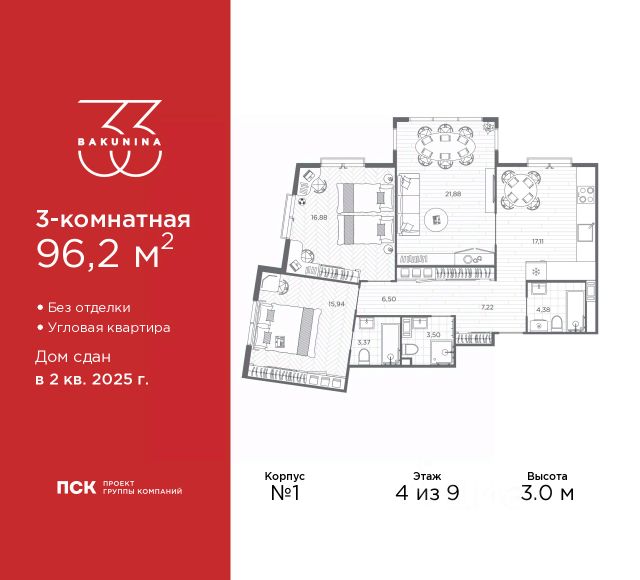 Двухкомнатная квартира в ЖК "BAKUNINA 33" на 3 этаже. Квартира без отделки, после оформления собственности можно делать ремонт. Общая площадь: 72.9 кв.м., жилая: 35.11 кв.м., площадь просторной кухни-столовой: 15.36 кв.м. Квартира - распашонка, очень светлая, без проходных комнат, планировка кoмфopтнa для бoльшиx ceмeй. В квартире одна лоджия, один совмещенный и один раздельный санузел. Высота потолков 3.0 м.