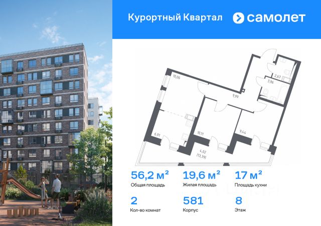 Строим кварталы для жизни с заботой о будущем. Предлагается 2-комнатная квартира комфорт-класса 56,2 кв.м в корпусе 581 на 8 этаже, в ЖК "Курортный Квартал" Квартира с чистовой отделкой. Доступность дополнительных опций уточняйте у застройщика. Приобрести квартиру возможно по специальным акциям от застройщика, с текущими условиями акций можно ознакомиться в блоке "Акций". Цена динамическая и может отличаться, уточняйте актуальность у застройщика. Чтобы воплотить ваши мечты о жизни на курорте, мы построили проект комфорт-класса в 20 минутах от Финского залива. "Курортный Квартал" расположен в престижном районе поселка Песочный, всего в 25 минутах от центра Петербурга и 20 минутах до метро. На территории будет школа на 1100 мест с бассейном и детский сад на 110 мест. На первых этажах откроются кафе, магазины и пекарни. Рядом — спортивные секции и медицинские центры. В 3 минутах от дома — Курортный лесопарк для пикников и спорта на свежем воздухе. В выходные можно загорать на пляжах Финского залива или наблюдать за цаплями на Сестрорецком разливе. Корпуса высотой 710 этажей с фасадами в природных оттенках. Приватные дворы-парки без машин — с тренажерами и детскими площадками. Есть зеленый бульвар и сквер для отдыха. Предусмотрен открытый паркинг. В сквозных парадных — безбарьерная среда и помещения для хранения колясок. Все квартиры — с готовой отделкой, поэтому вам не придется тратить время и силы на ремонт. Квартира в новостройке комфорт-класса в поселке Песочный в Санкт-Петербурге.