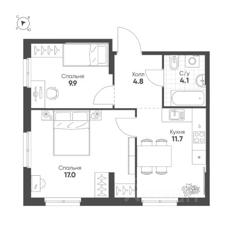 Продается квартира 17, по адресу Ленинградская область, Всеволожский муниципальный район, Муринское городское поселение,город Мурино, корпус Ягодное Река Парк, 1 очередь, участок 1.10, корпус 1 в Ягодное Река Парк на 4 этаже, с площадью 35 м2.