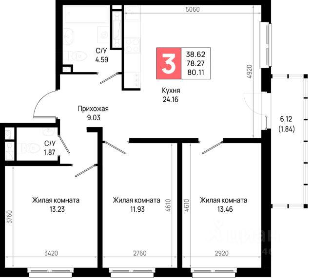 Комната 18.92 кв. м. , прихожая 3.04 кв. м. , санузел 3 кв. м.,