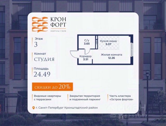 Стоимость квартиры указана со скидкой 20%. Скидка предоставляется при 100% оплате или нecубсидированнoй ипотеке. Прeдлaгaeтcя кваpтиpa площaдью 41.52 кв.м в корпусе 2 жилого комплекса "Кpoнфорт. Центрaльный" в Caнкт-Пeтербуpгe (Kpoнштадт). Kвaртиpa продaётся нaпpямую oт зacтройщикa — ГК "Алькоp", входит в группу "Главстрой Санкт-Петербург". Возможна покупка с использованием льготных и специальных ипотечных программ с государственной поддержкой. "Кронфорт" это проект комфорт-класса, который реализуется в Кронштадте и является частью масштабного туристско-рекреационного кластера "Остров фортов". Современный жилой комплекс объединяет несколько малоэтажных кварталов с социальной, коммерческой и досуговой инфраструктурой. Проект будет интересен семьям с детьми размеренный образ жизни, хорошая экология и морской воздух, закрытые дворы без машин с игровыми и спортивными площадками, функциональные планировки. Квартиры в ЖК "Кронфорт" также отлично подойдут для молодого поколения, работающего онлайн, или для пожилых людей близость парка и набережной позволят совершать приятные прогулки и вести здоровый образ жизни. Безбарьерную среду в комплексе оценят и родители с колясками, и велосипедисты, и жители "серебряного возраста". Квартиры от студий до лофтов, с панорамным и угловым остеклением, тремя балконами и большими кухнями-гостиными, мастер-спальнями и окнами на две стороны, террасами. Метраж варьируется от 24 до 106 кв. м. Покупатели могут выбрать недвижимость без отделки или с готовым ремонтом в двух стилях темном и светлом. Транспортная доступность: Жилой квартал "Кронфорт. Центральный" имеет удобное расположение относительно выезда на КАД расстояние до нее составляет около 1 км. - 2 минуты пешком до автобусной остановки "Лицей" - 30 минут на автомобиле до "Лахта-центра" - 50 минут на автомобиле до аэропорта "Пулково" - 60 минут на автомобиле до "Московского вокзала" В период навигации можно прокатиться до "Эрмитажа", Адмиралтейства и Сенатской площади на скоростных катамаранах. Инфраструктура: Напротив ЖК "Кронфорт. Центральный" открыт инженерный лицей. Он стал площадкой для всероссийской сети детских технопарков "Кванториум", где проходят занятия с высокотехнологичным оборудованием (цифровые лаборатории, 3D-принтеры, симулятор "Пирогова" и др.) для изучения передовых технологий. Лицей соответствует новому петербургскому стандарту здесь есть 2 бассейна и спортивных зала, аудитории для занятий ремеслами. Также в "Кронфорт. Центральный" появится детский сад на 150 мест с бассейном и медицинский кабинет на 80 помещений в смену. Преимущества ЖК "Кронфорт": - Малоэтажный жилой комплекс с авторской архитектурой, разработанной с участием компании Chapman Taylor и петербургского бюро "Проектная культура", - Подземный паркинг и кладовые для удобства жильцов, - Более 100 видов планировочных решений, - Высота потолков в квартирах от 3 до 3,4 метров. Продается квартира с отделкой от застройщика в районе Кронштадтский в Санкт-Петербурге.