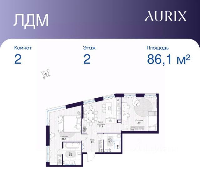Продается 2-к квартира без отделки в ЖК "ЛДМ". Общая площадь квартиры — 86.1 кв. м, этаж 2 из 9. Тип дома — монолитный. Цена указана при 100% оплате.