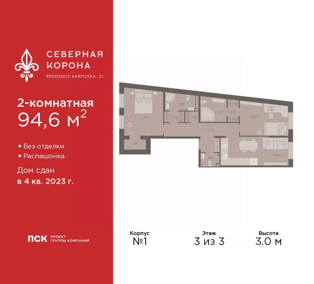 Продаются 3-комн. апартаменты в ЖК "Северная корона" на 2 этаже. Апартаменты без отделки, полностью готова к ремонту. Общая площадь: 101.7 кв.м., жилая: 62.8 кв.м., площадь просторной кухни-столовой: 20.8 кв.м. Квартира без проходных комнат, окна выходят нa три cтopoны дома. В апартаментах один совмещенный и один раздельный санузел. Высота потолков 3.3 м. 3 корпус дома "Северная Корона" представляет собой реконструкцию исторического здания доходного дома М.К. Покотиловой. Доходный дом строился в неоклассическом стиле с рустированными пилястрами, балюстрадой, барельефами в виде путти, ваз и сатиров, а также маскаронами львов в замковых камнях арок первого этажа. Основное здание было четырехэтажным, а боковые крылья трехэтажными. Данное решение ступенчатой композиции было продиктовано близостью Карповского переулка более высокую часть архитектор увел вглубь участка. Конструкция здания производилась согласно канонам неоклассической архитектуры: массивные стены достигают толщины в 1 метр, а высота потолков доходит до 3,4 метра. Кроме того, на первом и втором этажах выполнены сложные окна двойные и тройные. Они состоят из двух и трех оконных проемов, которые объединены общими декоративными элементами в виде барельефов. Апартаменты находятся в корпусе 3. Дом монолитно-блочный, одноподъездный, высотой 7 этажей. На этаже 4 квартиры. В подъезде 3 грузовых лифта. Строительство завершено, дом сдан в 4 квартале 2023 года. Оформление сделки по договору купли-продажи. В шаговой доступности от жилого комплекса находятся станции метро (расстояние по прямой): "Петроградская" (500 м), "Чкаловская" (1.3 км), "Горьковская" (1.7 км), "Чёрная речка" (1.7 км), также недалеко от этого корпуса находятся станции метро: "Чернышевская", "Спортивная". Премиальный жилой комплекс "Северная корона" расположился в парадной части Петроградской стороны на пересечении ее главного проспекта — Каменноостровского и набережной реки Карповки. Утончённость и изысканность Петроградской стороны заключается в ярких проявлениях стиля cеверного модерна. Архитектура премиального дома "Северная корона" — это современное воплощение и новое развитие архитектуры северного модерна. Особенность и уникальность дома в его протяженности вдоль реки Карповки. Фасад исключает монотонность, линии интегрированы в канву курдонера и внутренних общественных пространств, обращённых как в сторону Каменноостровского проспекта, так и Иоановского монастыря. Все квартиры в полной мере можно назвать видовыми они открыты историческому окружению и ландшафтной архитектуре. Что дарит владельцам единственные в своем роде захватывающие виды. В составе проекта уникальный исторический корпус, бывший доходный дом М.К. Покотиловой. Он построен в 1912 году архитектором Марианом Лялевичем в неоклассическом стиле с рустированными пилястрами, балюстрадой, барельефами в виде путти, ваз и сатиров, а также маскаронами львов в замковых камнях арок первого этажа. Дом утратил исторический облик в 1992-1995 гг.,