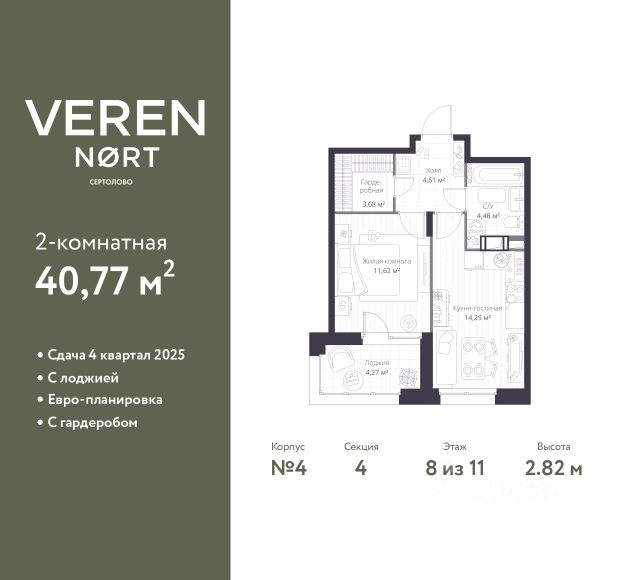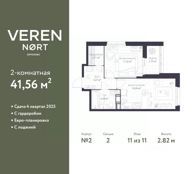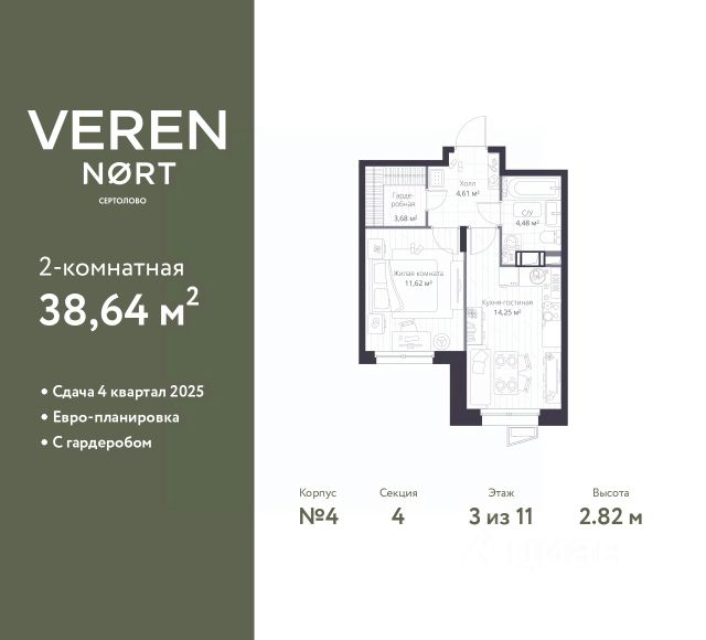 Успейте забронировать на этих условиях! Предложение ограничено! Стоимость квартиры указана со скидкой, ваша экономия составит 1,649,131 RUB. По всем вопросам обращайтесь в офис продаж, мы вам все подробно расскажем! Однокомнатная квартира в Veren Nort Сертолово на 5 этаже. Квартира без отделки, новый собственник может сделать ремонт по своему дизайн-проекту. Общая площадь: 32.72 кв.м., жилая: 11.7 кв.м., площадь просторной куxни-гостиной: 11.14 кв.м. Все окна выходят на одну сторону. В квартире один балкон, один совмещенный санузел. Высота потолков 2.82 м. Квартира находится в корпусе 2. Дом монолитный, одноподъездный, высотой 11 этажей. На этаже 14 квартир. В подъезде 1 пассажирский и 1 грузовой лифт. Начало строительства - 3 квартал 2023 года. Окончание строительства - 4 квартал 2025 года. Оформление сделки по договору долевого участия. С балконом, с гардеробом, вид на приватный двор. Сочетание современной архитектуры и отличной экологии севера Лен. области. Выразительный облик домов разработан именитым архитектурным бюро "Остоженка". Характеристики жилого комплекса исключительны: продуманный ландшафтный дизайн, оригинальные парадные, разработанные по индивидуальному дизайн-проекту, современные детские и многофункциональные спортивные площадки, летний кинотеатр под открытым небом, два детских сада. Комплекс создается в уже сложившейся инфраструктуре г. Сертолово и обладает удобным транспортным сообщением с Санкт-Петербургом. В 300 метрах от "VEREN NORT сертолово" планируется транспортно-пересадочный узел "Сертолово", который обеспечит удобную железнодорожную связь с Финляндским вокзалом Санкт-Петербурга. #234c6b Купить квартиру в ипотеку в новостройке от застройщиков в Сертолово.
